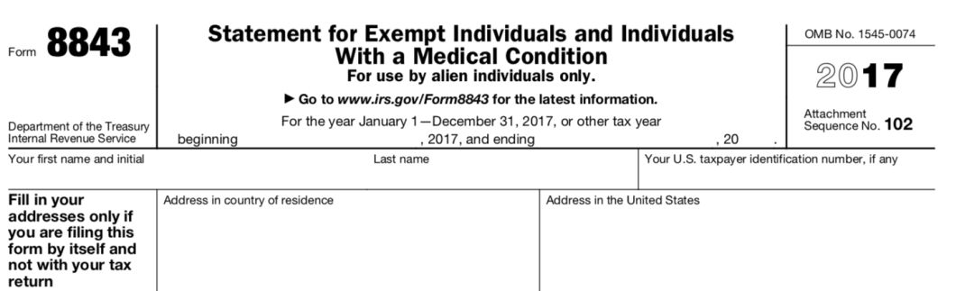 Form 8843是F-1身份的留学生向IRS提交的个人资料表,通过表明F-1身份来证明自己并未通过实际居留天数测试,从而最终达到税款豁免的目的。